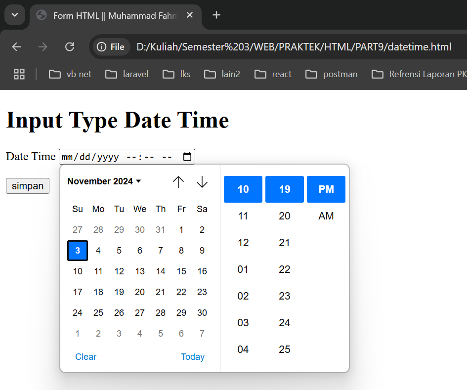- <input type="time"> : yang berfungsi sebagai tempat input waktu atau jam